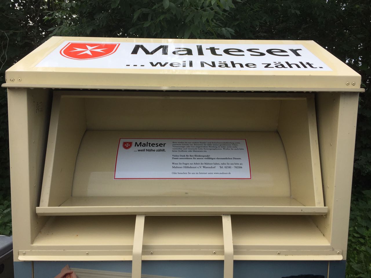 Zunächst nahmen zwei Malteserhelfer die Kleidung an. Schnell wurden sie durch weitere Helfer unterstützt. Weitere Lösungen wurden gesucht und es wurden an verschiedenen Standorten Gebrauchtkleidercontainer aufgestellt. Seitdem werden die Container durch unsere Helfer/innen ehrenamtlich geleert. Derzeit stehen in Warendorf und Umgebung 24 Container, die von derzeit 12 Helfer/innen und zwei Fahrzeugen jede Woche bei Wind und Wetter geleert werden. Die Gruppe wird dabei auch von der Malteser Jugend-SEG tatkräftig unterstützt. Seit 2014 sind wir auch Partner für das Projekt "Engagement Ehrenamt" in Warendorfer Schulen und geben Schüler/innen die Möglichkeit, ihre Projektstunden zu leisten.